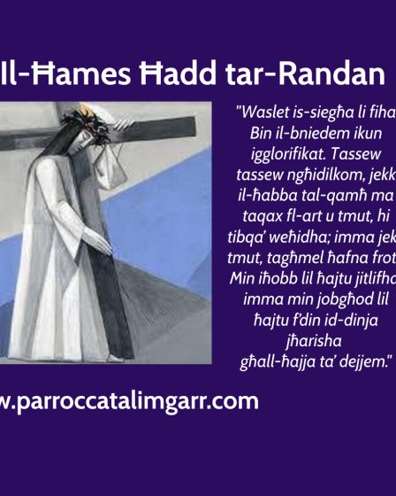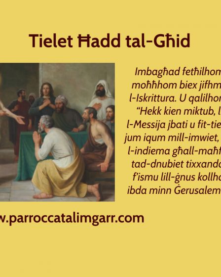Matul din il-ġimgħa nkunu qed niċċelebraw il-Ġimgħa Mqaddsa. Il-Knisja Parrokkjali tkun miftuħa għat-talb fil-privat, bħas-soltu, minn nhar it-Tnejn sal- Erbgħa, fil-Għodu u fil-għaxija. Ħamis ix-Xirka l-Knisja se tkun miftuħa wara l-Quddiesa ta’ fil-għaxija, u nhar il-Ġimgħa l-Kbira, matul in-nofs ta’ nhar ta’ filgħodu. Sibt il-Għid il-Knisja tkun magħluqa l-ġurnata kollha. Għada/Illum, il-Ħadd 28 ta’ Marzu …