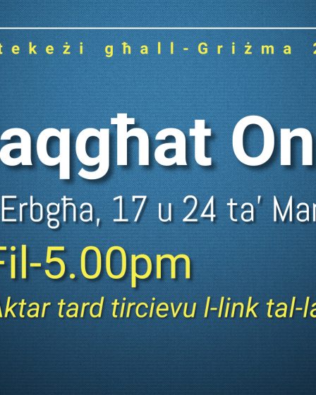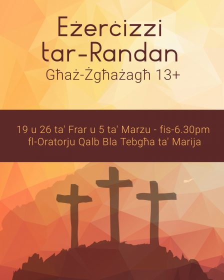 19 ta’ Frar, 26 ta’ Frar u 5 ta’ Marzu – Eżerċizzi għaż-żgħażagħ 13+ immexxija minn Dun Mark Mallia Pawley, fl-Oratorju.