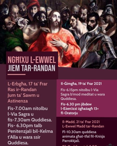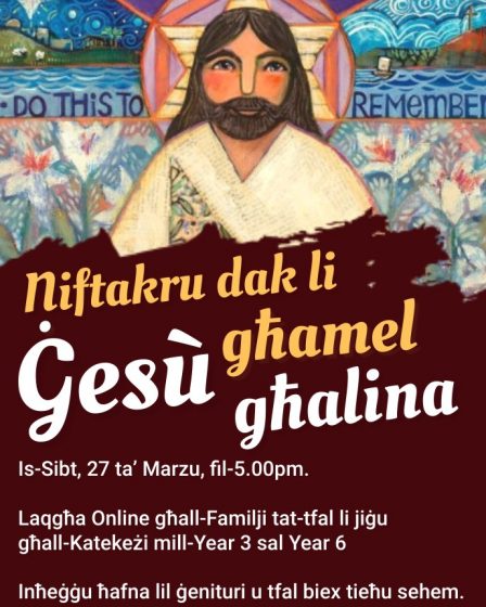 Irridu naslu biex niċċelebraw il-misteru tat-tbatija, il-mewt u l-qawmien ta’ Ġesù. Dan l-misteru rridu ngħixuh f’ħajjitna. Din trid tkun sejħa speċjali li tpoġġi fina l-kuraġġ u r-rieda biex f’ħajjitna nagħrfu lil Ġesù “u l-qawwa tal-qawmien tiegħu mill-imwiet” (Fil 3, 10). XANDIRIET ONLINE: Diversi ċelebrazzjonijiet se jkunu mxandra live fuq il-paġna tal-Facebook – Parrocca Santa Marija …